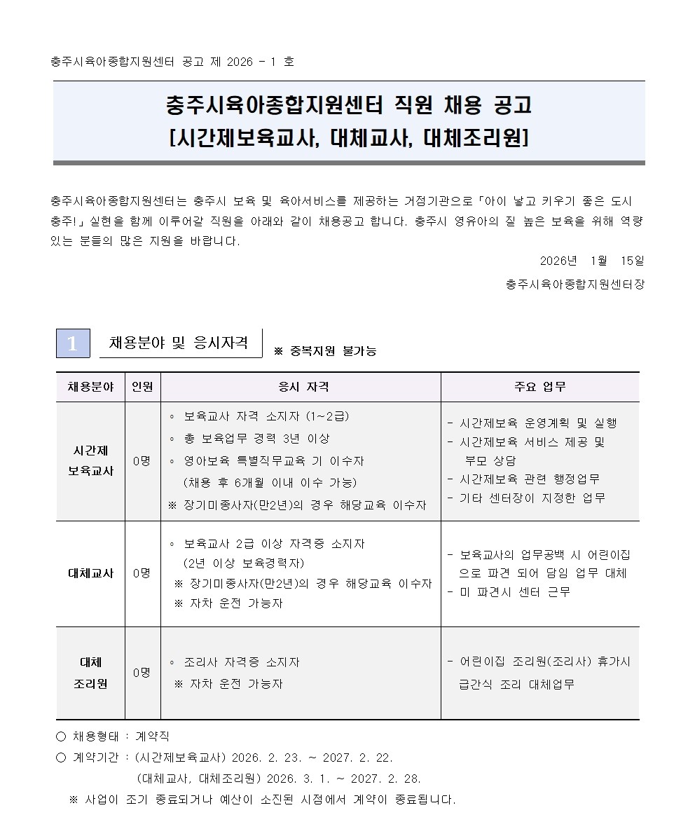 [ä¿ë] ÃæÁÖ½ÃÀ°¾ÆÁ¾ÇÕÁö¿ø¼¾ÅÍ Á÷¿ø ä¿ë°ø°í (½Ã°£Á¦º¸À°±³»ç, ´ëü±³»ç, ´ëüÁ¶¸®¿ø)