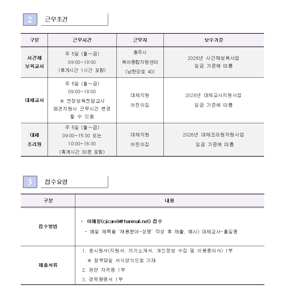 [ä¿ë] ÃæÁÖ½ÃÀ°¾ÆÁ¾ÇÕÁö¿ø¼¾ÅÍ Á÷¿ø ä¿ë°ø°í (½Ã°£Á¦º¸À°±³»ç, ´ëü±³»ç, ´ëüÁ¶¸®¿ø)