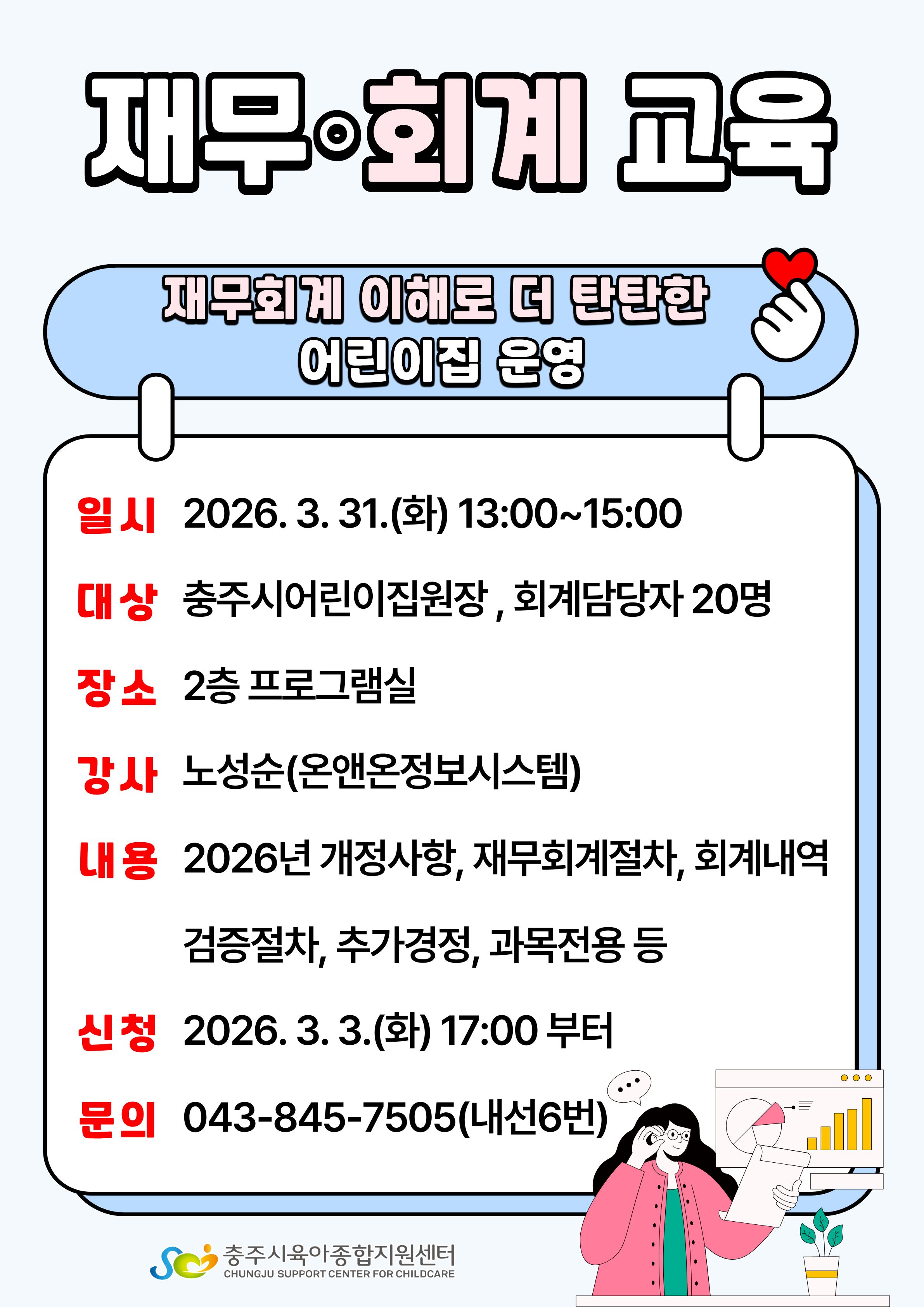 | ±âŸ»çÇ× | * ½Åû¹æ¹ý: ÃæÁÖ½ÃÀ°¾ÆÁ¾ÇÕÁö¿ø¼¾ÅÍ È¨ÆäÀÌÁö > ·Î±×ÀÎ > ¾î¸°ÀÌÁýÁö¿ø > º¸À°±³Á÷¿ø±³À° > ÇØ´ç ±³À°¸í Ŭ¸¯ > ½Åû * ½ÅûÀü ¾î¸°ÀÌÁý¸í°ú ÈÞ´ëÀüȹøÈ£¸¦ È®ÀÎÇØÁֽñ⠹ٶø´Ï´Ù. * ÇùÁ¶»çÇ× - ±³À° ½ÃÀÛ 5ºÐÀü±îÁö Âø¼® ÇØ Áֽñ⠹ٶø´Ï´Ù. - ±³À° ½ÃÀÛ 20ºÐ ÀÌÈÄ ÀÔÀå ½Ã ¼ö·á󸮰¡ ºÒ°¡ÇÕ´Ï´Ù. |