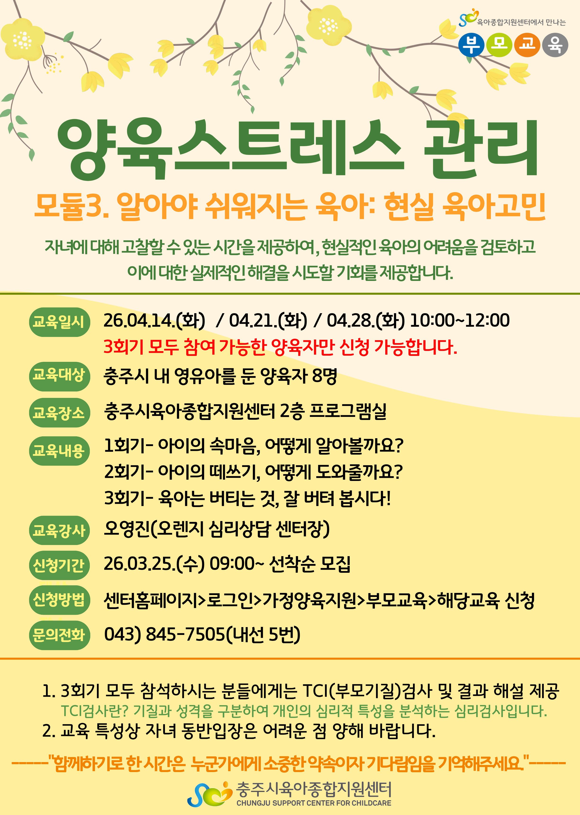 -1~3ȸ±â ¸ðµÎ Çʼö Âü¼®ÀÔ´Ï´Ù. (ÀÏÁ¤ È®ÀÎ ÈÄ ½Åû ºÎʵ右´Ï´Ù.) -¾çÀ°½ºÆ®·¹½º °ü¸® ºÎ¸ð±³À°Àº Áý´Ü»ó´ã Çü½ÄÀ¸·Î ÁøÇàµÇ¸ç, À°¾Æ·Î ÁöÄ£ ³ª ÀÚ½ÅÀ» µ¹¾Æº¸°í , Âü¿©ÀÚµé °£ °ø°¨, ¼ÒÅë ÇÏ´Â ½Ã°£À» ÅëÇØ ³ª·Î¼ÀÇ ¼ºÀå, ºÎ¸ð·Î¼ÀÇ ¼ºÀåÀ» ÇÔ²² °Ý·ÁÇϰíÀÚ ÇÕ´Ï´Ù. |